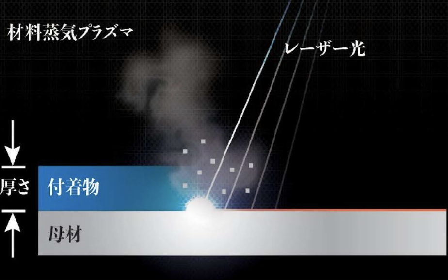 この際、蒸発と同時に発生する微小な衝撃圧力によって、付着物が母材から剥離する現象を利用しています。
