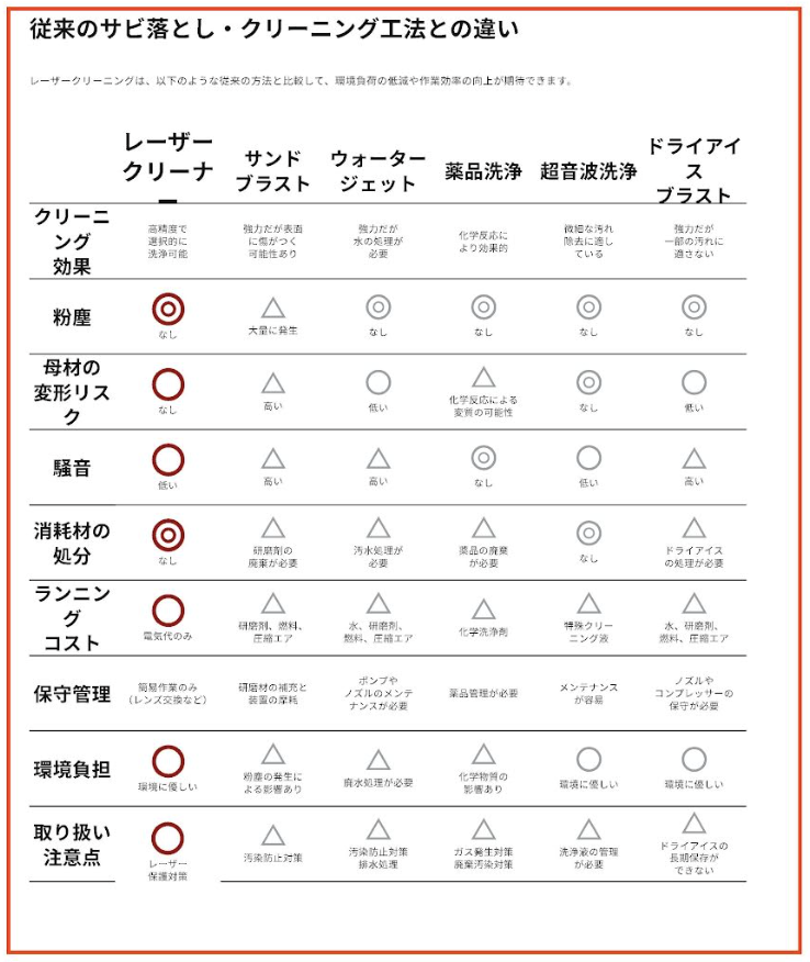 従来のブラスト処理や薬品処理とは異なり、母材を傷つけず、粉塵や廃棄物も最小限に抑えられる「レーザー工法」は、
